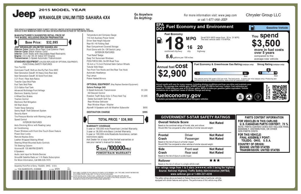 ENGINE: 3.6L V6 24V VVT, TRANSMISSION: 5-SPEED AUTOMATIC (W5A580), QUICK ORDER PACKAGE 24G, 3.21 REAR AXLE RATIO, WHEELS: 18" X 7.5" POLISHED SATIN CARBON, HYDRO BLUE PEARL COAT, BLACK, CLOTH BUCKET SEATS, BODY COLOR 3-PIECE HARD TOP, ALPINE 9-SPEAKER W/ALL WEATHER SUBWOOFER, MANUFACTURER'S STATEMENT OF ORIGIN