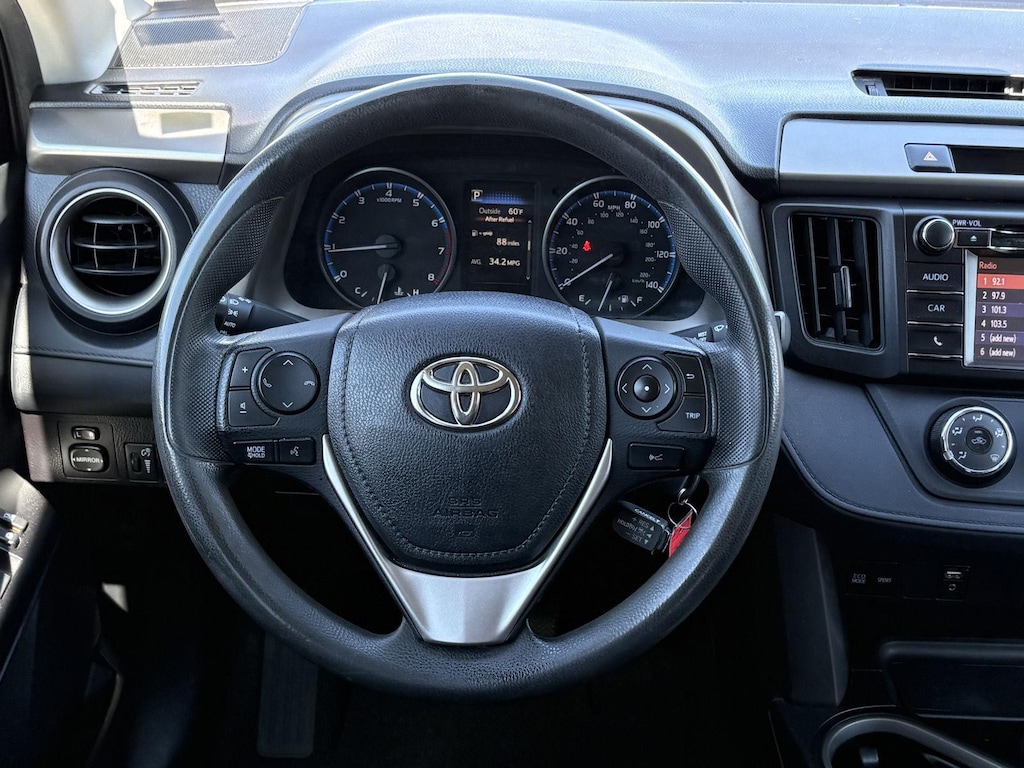 Step inside the 2018 Toyota RAV4 LE and experience a comfortable and functional interior. The Black cloth front seat upholstery offers a pleasant seating surface for both driver and passengers. The manual climate control allows you to easily adjust the temperature to your liking. Enjoy the convenience of power door locks with 2-stage unlocking and power first and second-row windows. The cruise control with steering wheel mounted controls makes long drives more relaxing. Additional features include 3 12V power outlets, retained accessory power, remote panic alarm, and a cargo area light for added convenience. The 60-40 folding rear seats provide flexible cargo space, and the All Weather Floor Liners and Cargo Tray help protect the interior from the elements.